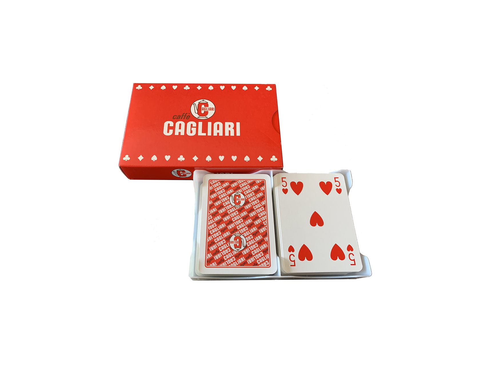 Cofanetto con 54 carte da gioco ramino realizzate da Modiano in cartoncino plastificato e personalizzate Caffè Cagliari.