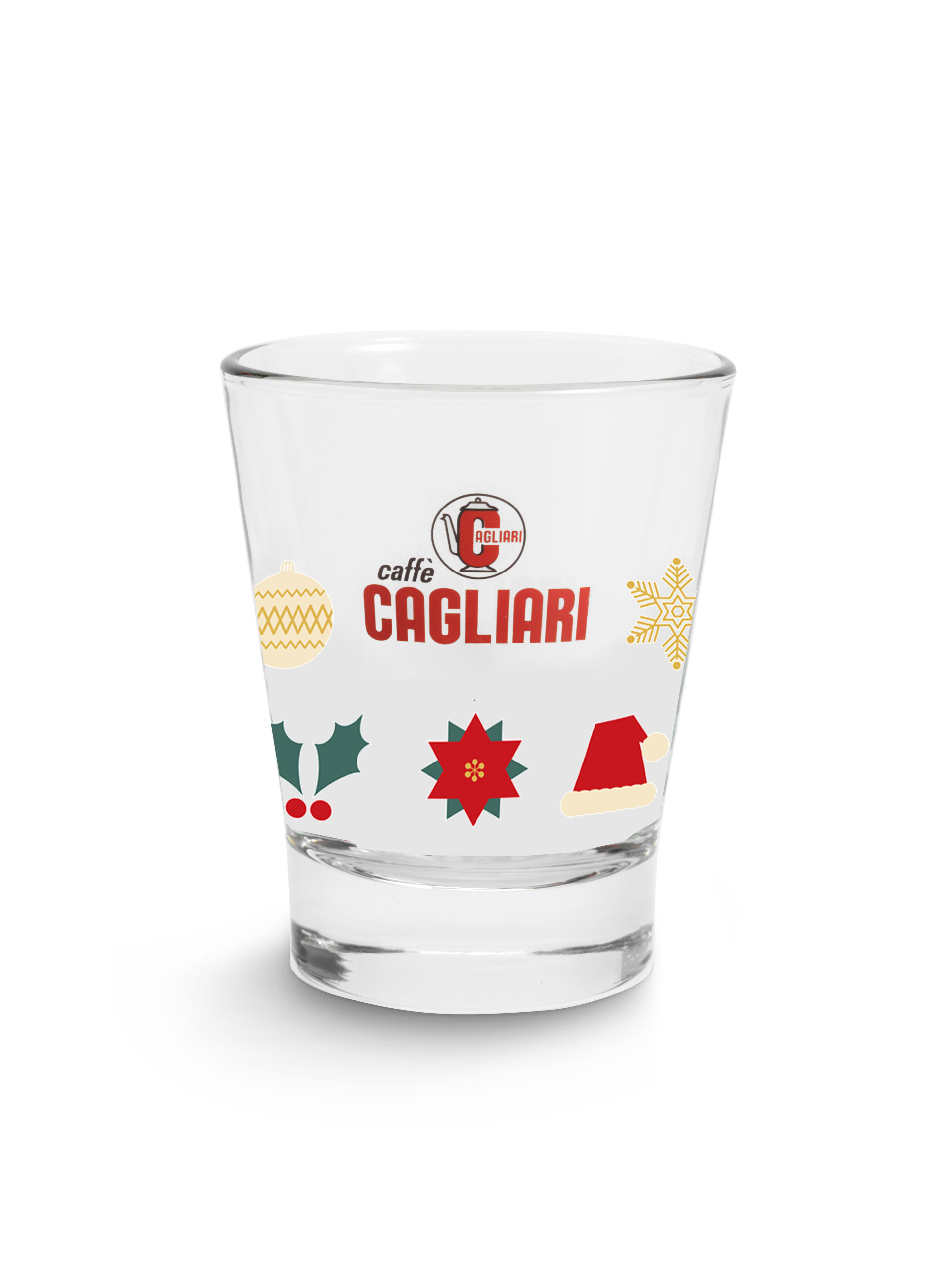 Set composto da 6 bicchierini in vetro personalizzati con il logo Caffè Cagliari e decorazione natalizia.